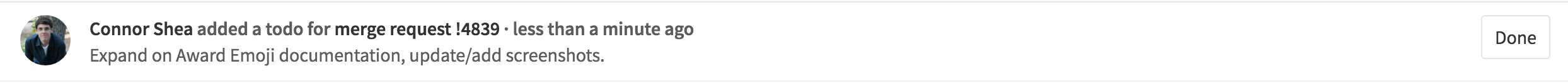 Any action to the corresponding issue or merge request will mark your Todo as Done. Actions that dismiss Todos include:
